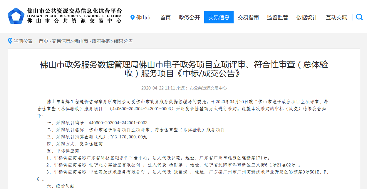 中檢賽辰技術(shù)服務(wù)有限公司(以下簡(jiǎn)稱:賽辰)2020年4月22日以競(jìng)爭(zhēng)性磋商方式優(yōu)勝其他同行競(jìng)爭(zhēng)者,成功中標(biāo)【佛山市某某局佛山市XX項(xiàng)目立項(xiàng)評(píng)審、符合性審查(總體驗(yàn)收)服務(wù)項(xiàng)目】。